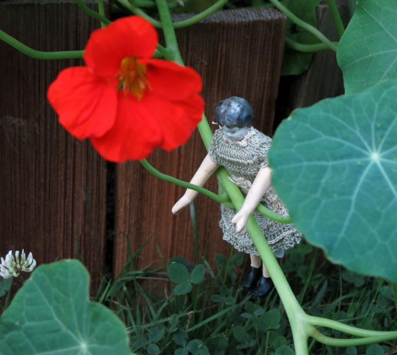 Mudlark doesn’t mind climbing around in the nasturtiums…