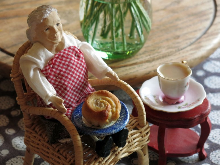 • we buttered the leftover dough, and sprinkled some cardamom sugar on it before rolling it up. Mormor baked it in a Human-sized tartlet tin for about ten minutes! Fiddly but delicious (she wishes she could mail one to Cousin Ida).