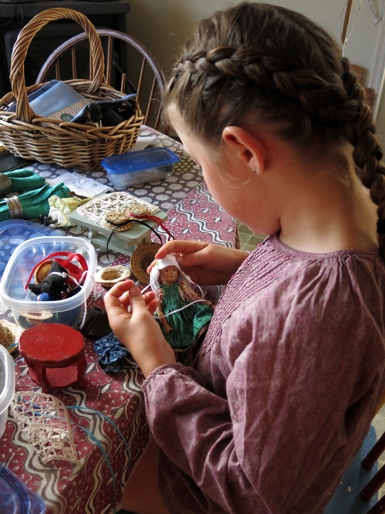 The youngest human investigated the stash of Hitty hats and bonnets…