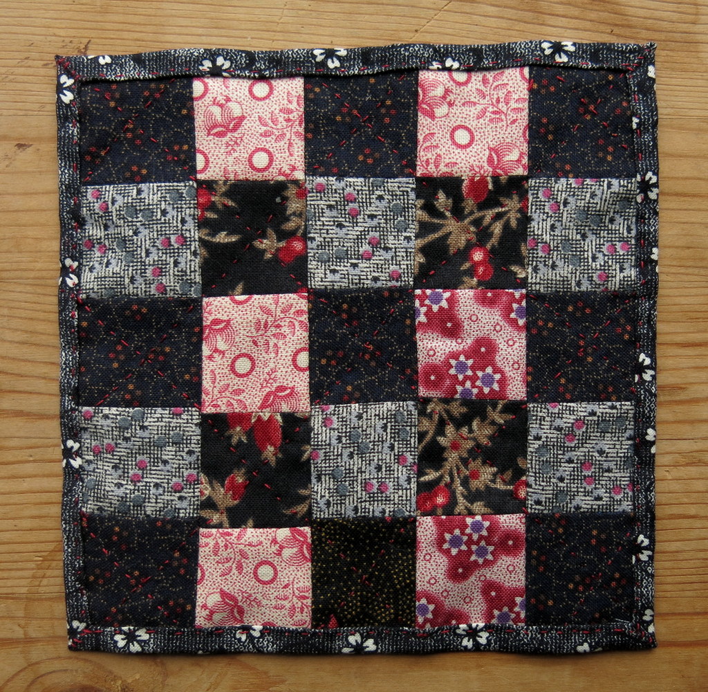 My three little quilts were made for a mini-workshop on mini-quilting last weekend: the encyclopedia quilt; this five-inch square quilt; and the browns and reds one I posted a few days ago. All three quilts used scraps from Ross Bay Villa’s scrap bag!