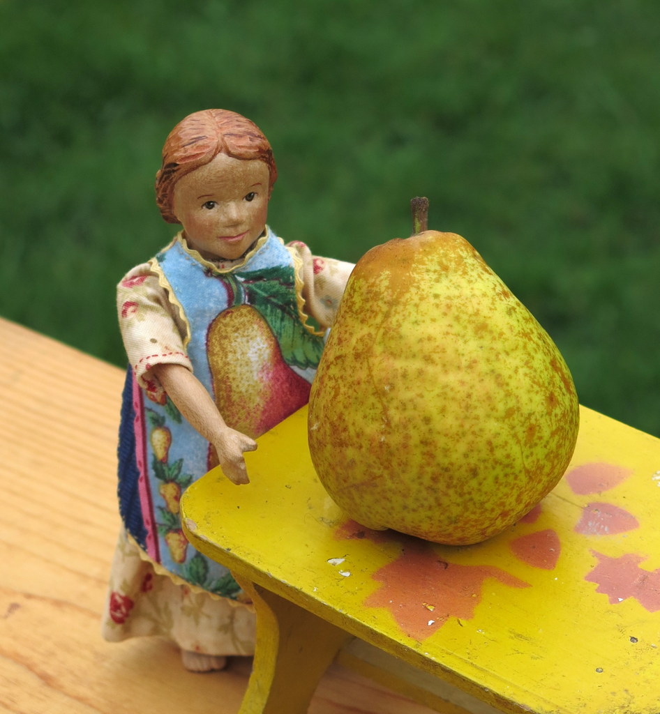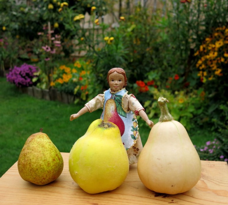 How interesting – to see the butternut squash and quince look like large pears !! Hitty’s apron is lovely