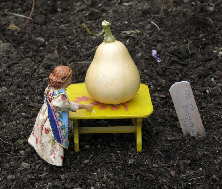 It was strange that this particular squash wanted to be pear-shaped…perhaps it looked up and admired the fruit on the pear tree above the squash bed…the other squashes look more butternut squashy! We like the apron too!