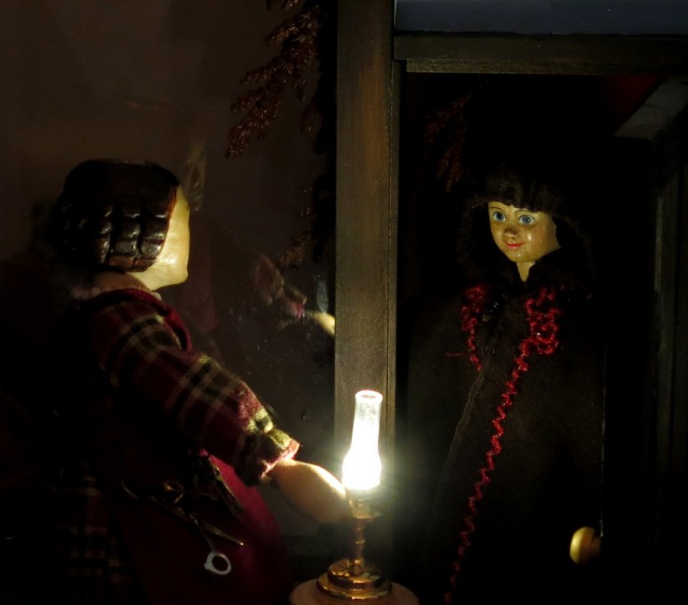 2. what an exciting entrance…love the story and the photos. The glowing lamps…so perfect! The image of the stranger in her long cloak..so mysterious. I am sure she will have many adventures with the Quimper Cupboard family.