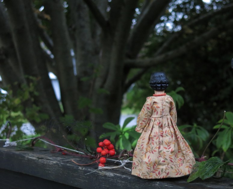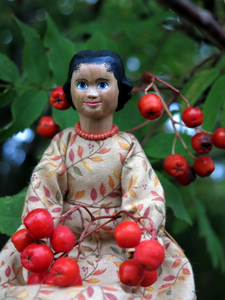 Oh dear, I thought I had signed up to follow the Quimper Hitty blog, but maybe not. Hitity Willa has such a happy look on her face at discovering her “relatives,” the mountain ash trees and their yield of Hitty-sized apples. She must feel quite at home with you there. Judith