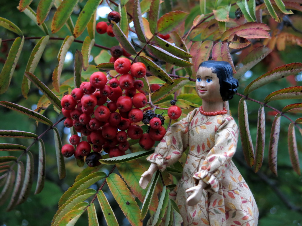 Oh dear, I thought I had signed up to follow the Quimper Hitty blog, but maybe not. Hitity Willa has such a happy look on her face at discovering her “relatives,” the mountain ash trees and their yield of Hitty-sized apples. She must feel quite at home with you there. Judith