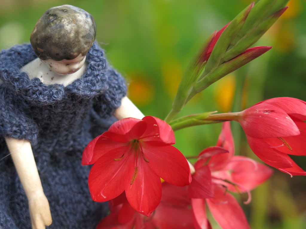 …but the sunny afternoon was too tempting! They dashed outside to examine the Schizostylis Lily that has been attracting the hummingbirds…
