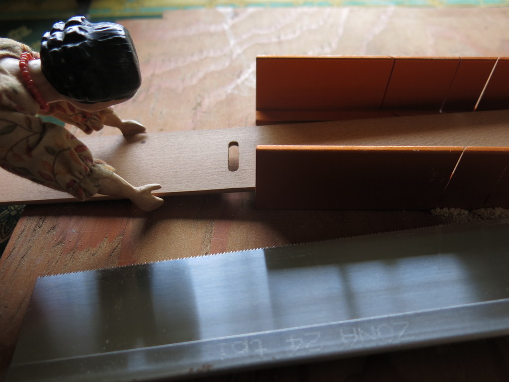 Then we sawed the uprights and the cap piece for the bookshelf out of a meter stick.