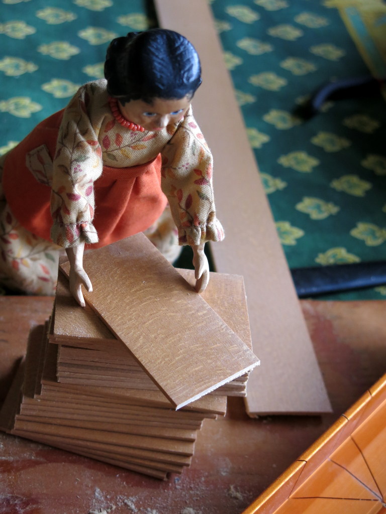Willa helped with the sawing of a stack of short pieces of old used wooden blinds from IKEA, 25 of them were for the Christmas project, five slightly longer ones for book shelves and three for the bookshelf back.