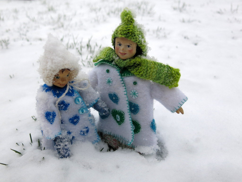 Oh those lovely coats on those lovely little wooden girls. The snow angel made me smile!! Wonderful photos!!