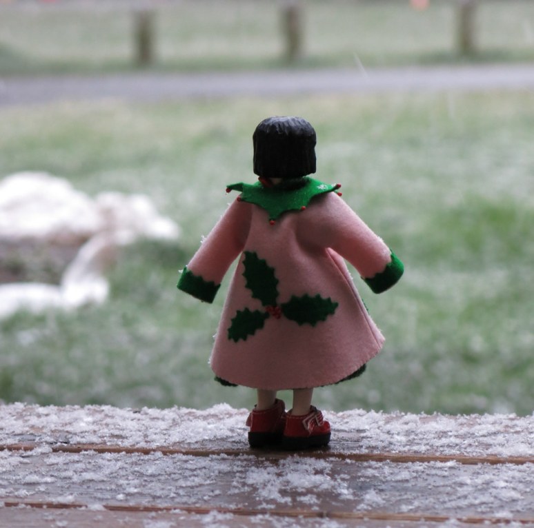 Holly was finished just in the nick of time to be a Christmas day gift for the youngest human. I dressed her in a green knitted dress, and tucked her into a little dolly bed, and wrapped everything in a shoe box.  Because of the box, young human was expecting shoes, but when she saw who was inside she whispered “It’s Holly!” in the most endearing and gratifying way.