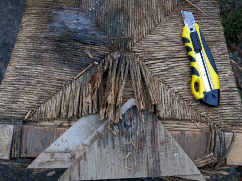 I have also been re-rushing a chair that I found at the side of the road (after pulling off the mouldy rushes, applying steel-wool and sandpaper to the wood, and rubbing on a coat of “Puritan Pine”). The chair had an original seat of real rushes, but the material sold nowadays for this purpose is made of twisted brown recycled paper (possibly there is an old pizza box or two in there?). Cardboard is inserted into the seat between the layers to soften the edge of the seat rail, and provide a bit of cushioning.