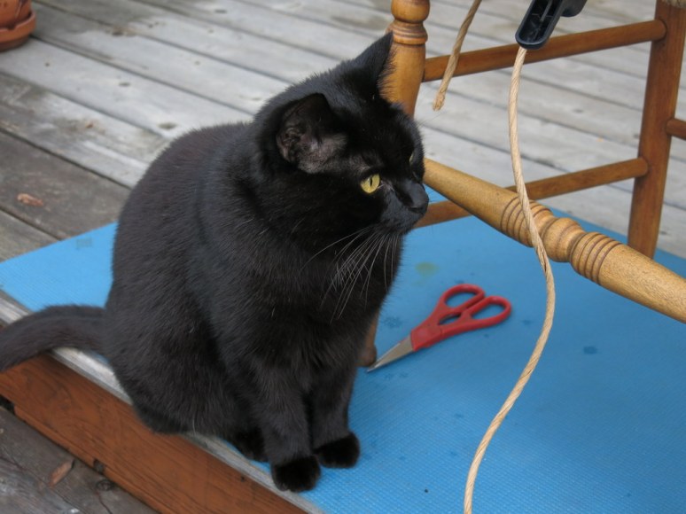 I re-caned a chair for my parents about that long ago…the chair just came to live with me after my mother died and my dad went into assisted living. What fun to see (and sit on) it again! I was thinking about tracking down some proper rushing instructions but ended up with the paper twine…mostly because I didn’t want to wait until August to go hunt up a friendly ditch. I am not completely thrilled with the look but it’s much better than mouldy rushes and I do like the way it is shaping up.