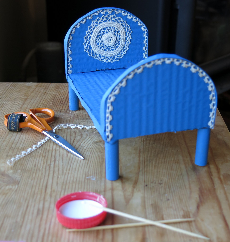 …and I used another pizza box top to make a some cardboard Hitty furniture including this elegant bed (I posted a full tutorial a few days ago on January 8th)…