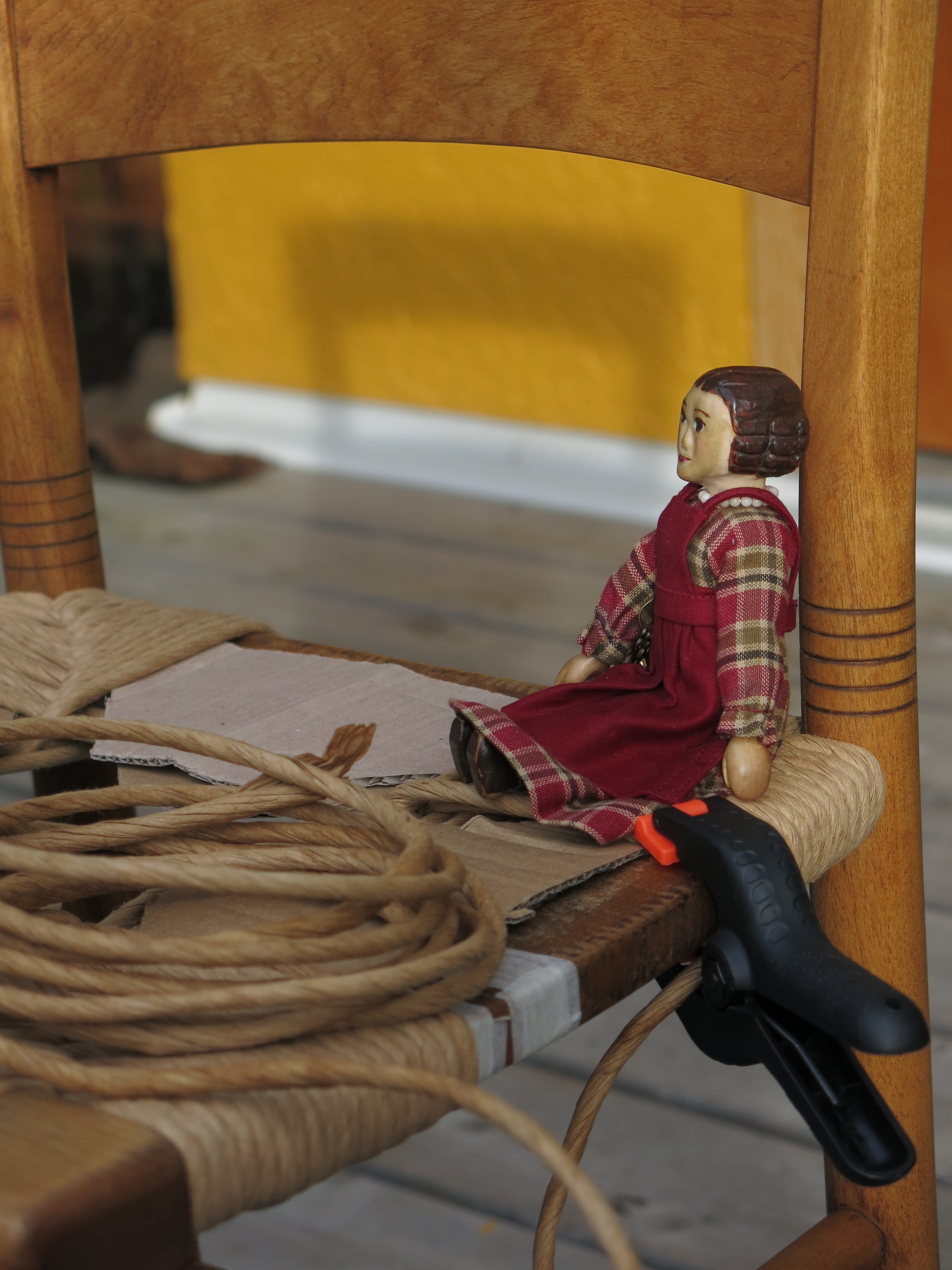 I re-caned a chair for my parents about that long ago…the chair just came to live with me after my mother died and my dad went into assisted living. What fun to see (and sit on) it again! I was thinking about tracking down some proper rushing instructions but ended up with the paper twine…mostly because I didn’t want to wait until August to go hunt up a friendly ditch. I am not completely thrilled with the look but it’s much better than mouldy rushes and I do like the way it is shaping up.