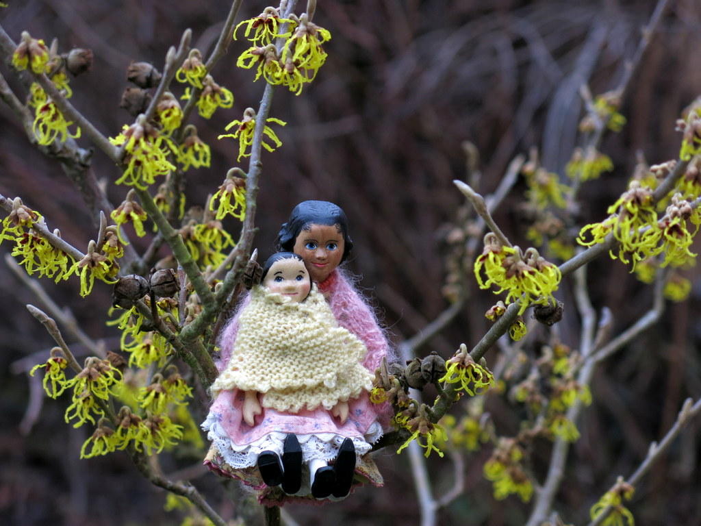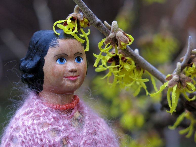 • Gilly and Willa looked out the window and saw the Witch Hazel in bloom, so they dug out some yellow and pink clothes to pay it a visit. I like the saxifrage too – such a pretty plant. I planted the Witch Hazel in that spot because I can see it from my workroom window!