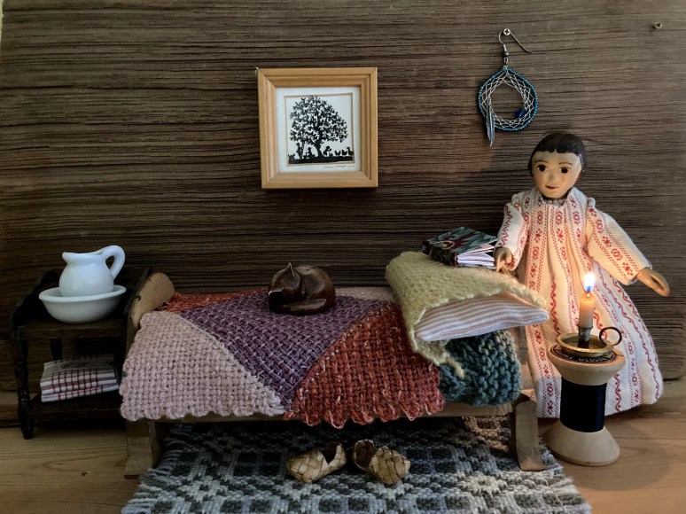 Now that is a real winter warmer bedroom, Constance! From the Welsh style rug on the floor, the candle burning brightly to the wonderful, warm coverlet I can’t imagine a better place to snuggle down for a bedtime read followed by a good night’s sleep. What a cozy nightgown too.