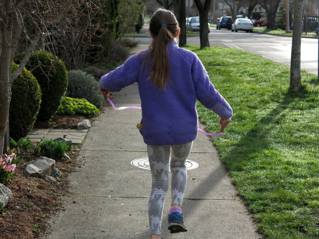 It is colder than it looks outside! Small human kept warm by skipping, and Henrietta warmed up in her snuggly pocket!
