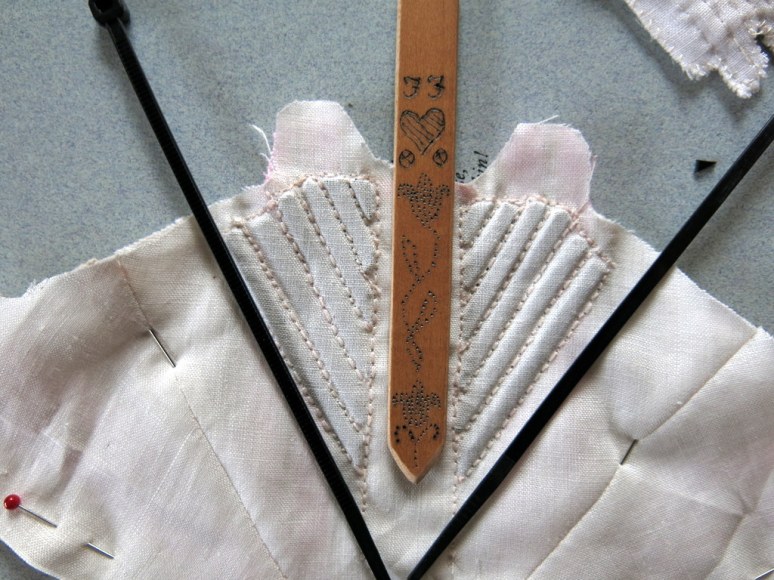 …and the linen channelled…busk inserted down a pocket at the centre front, and “Whalebones” stitched in at angles.
