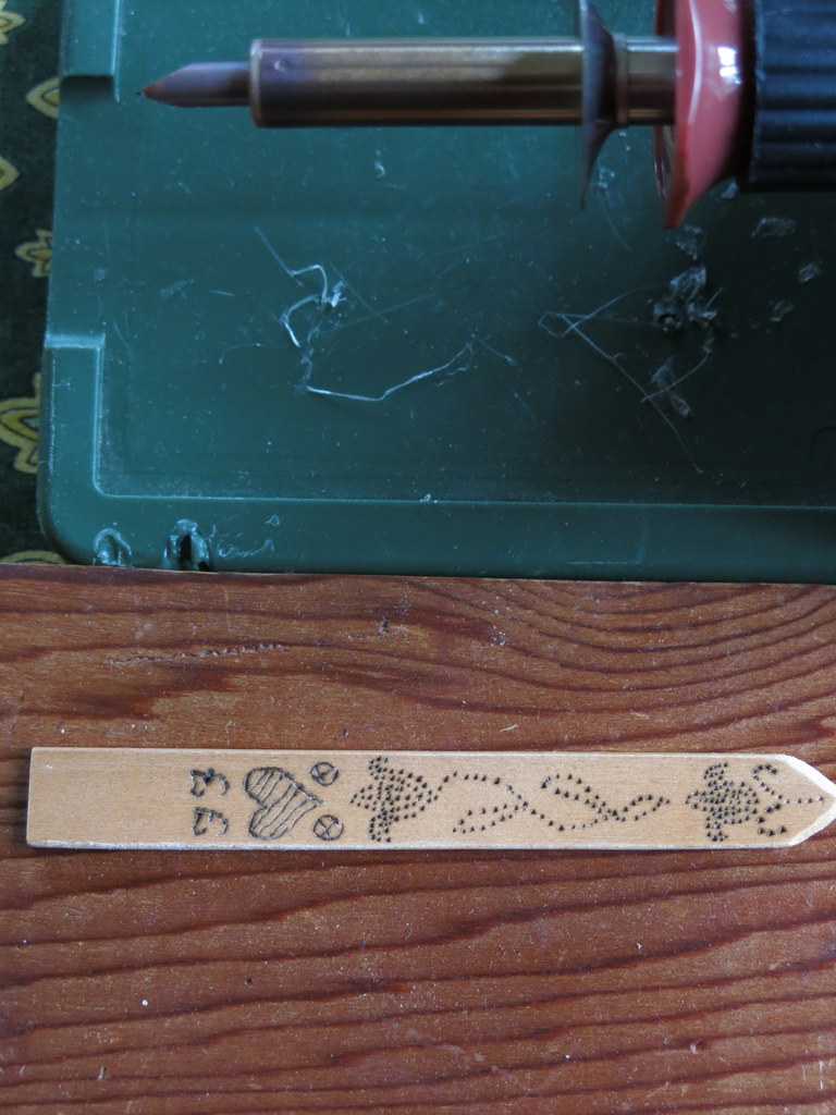 The wood was trimmed, shaped and decorated with a wood-burned design…