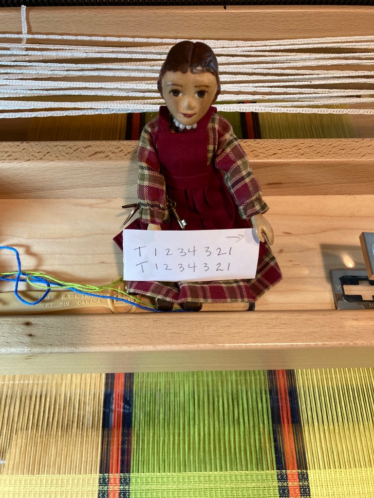 Constance and I have been working on a Waffle Weave tea towel…it is a little complicated so we have to refer to the treadling pattern on a piece of paper until we’ve got the rhythm – Constance is very good at holding the paper, and keeping me on track.