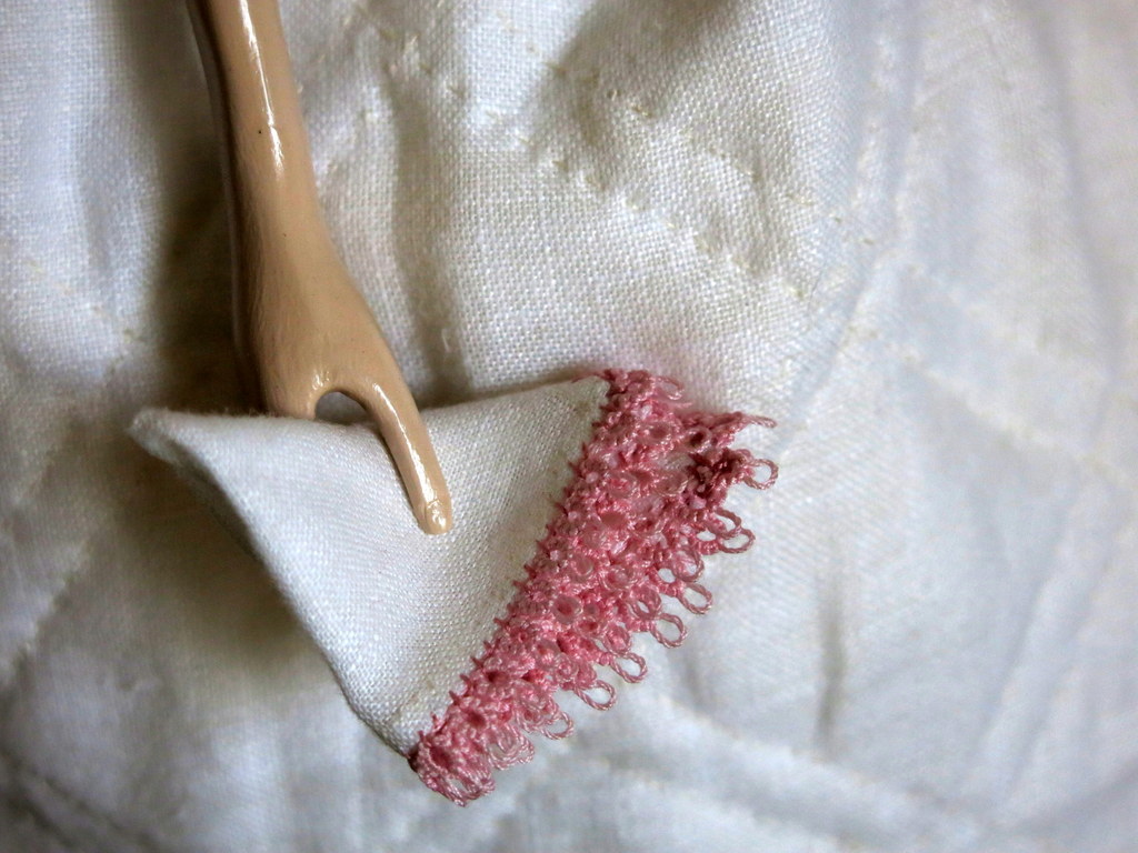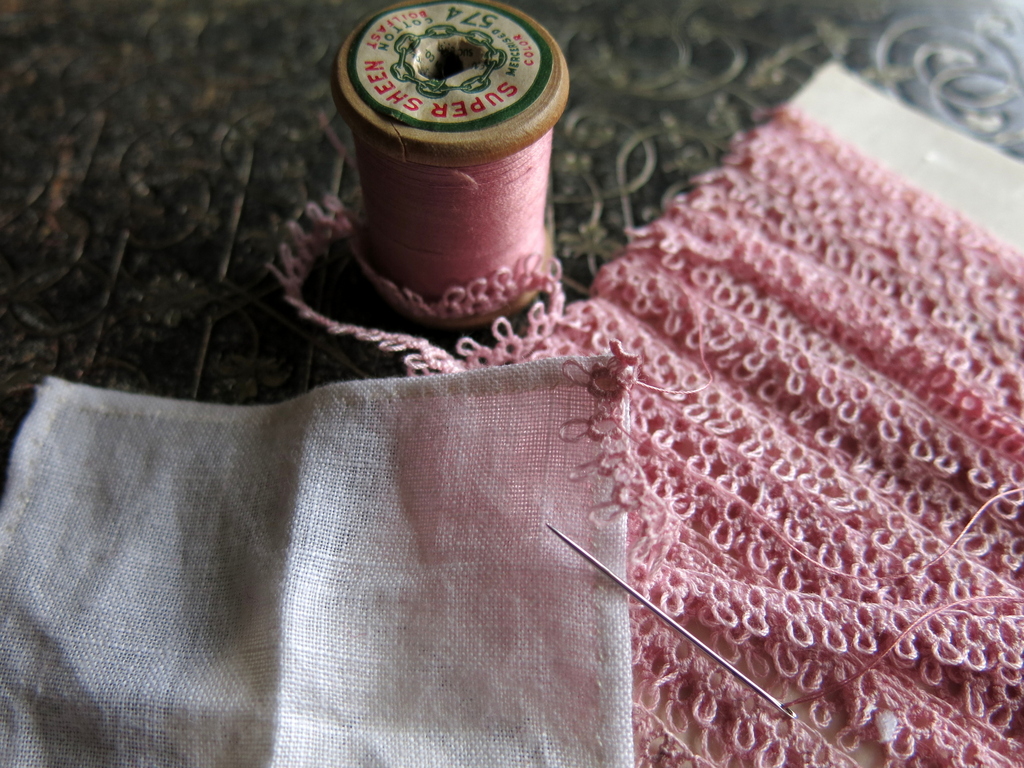 …and the final scrap of the day is a tiny square of linen leftover from the petticoat, trimmed with a wee bit of tatting from Lady Frances’s trunk…