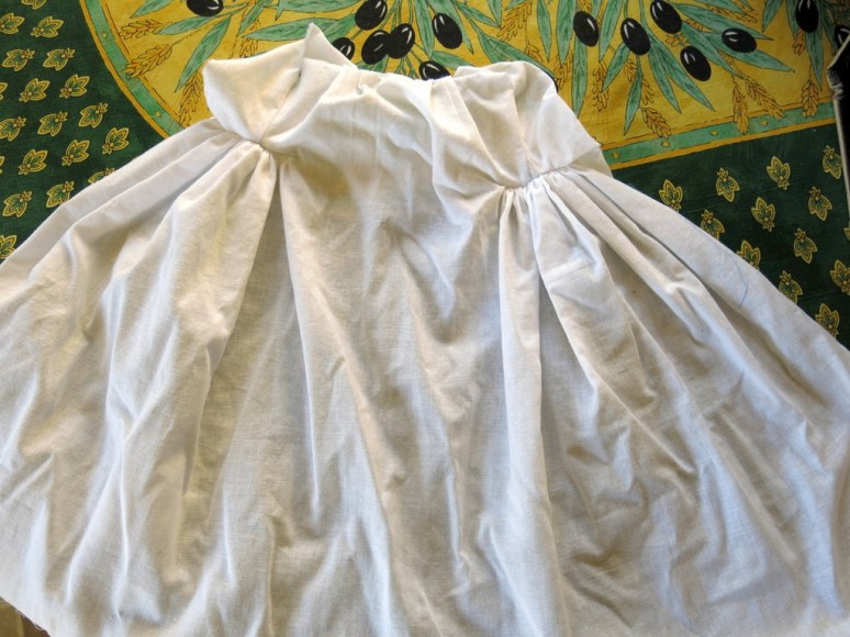 This is a “muslin” – a fabric  mock up of the final shape of a gown, which I also found in Lady Frances’s Trunk.  But a gown the shape of this muslin would not have fit over the panniers, even in their unmodified shape, so…