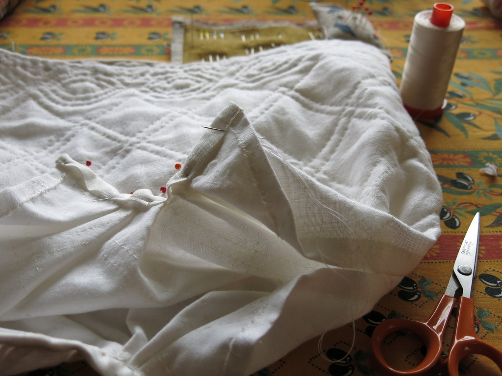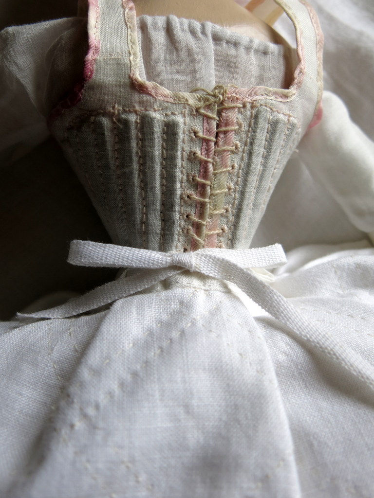 Along with the muslin petticoat lining, there is some padding made from a scrap of my Provencal Quilt, and a top layer made from a scrap of linen from the human petticoat I took apart last month.
