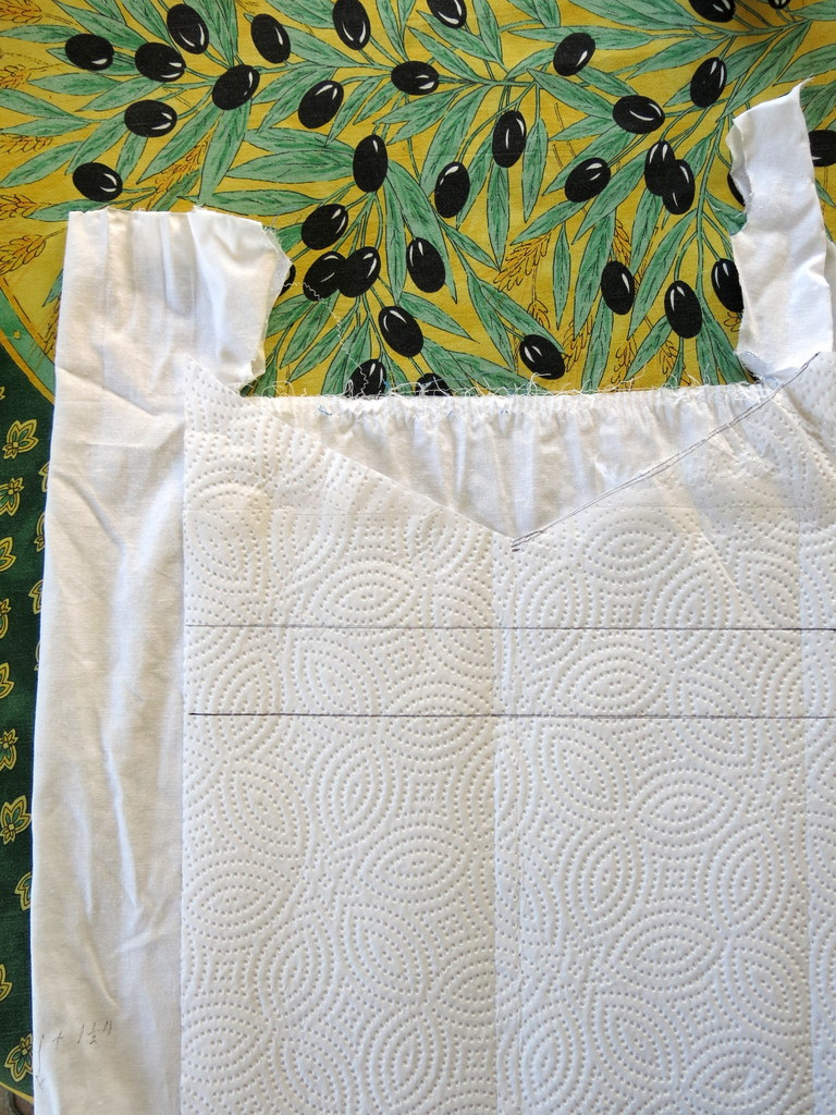 …and stitched the design through the layers. Then I stitched one side seam, the hem, and then the other side seam…side seams only go  part way from hem to waist, because…