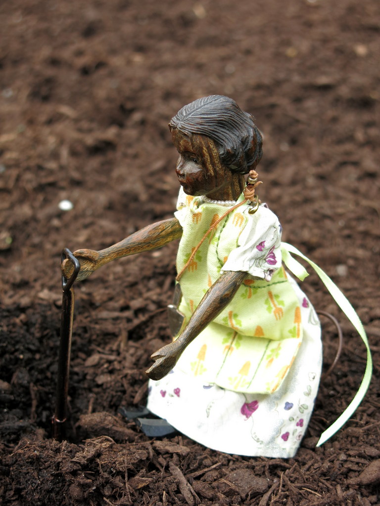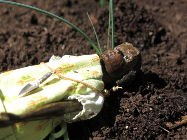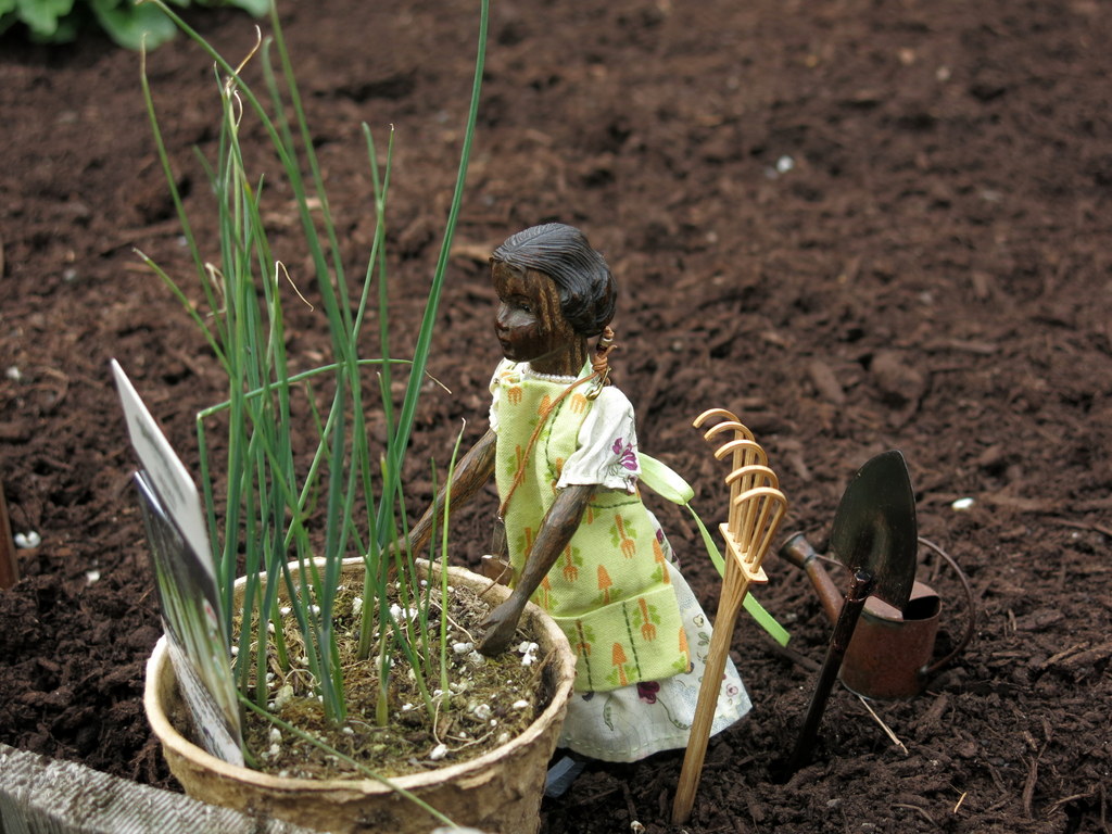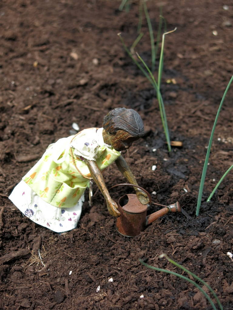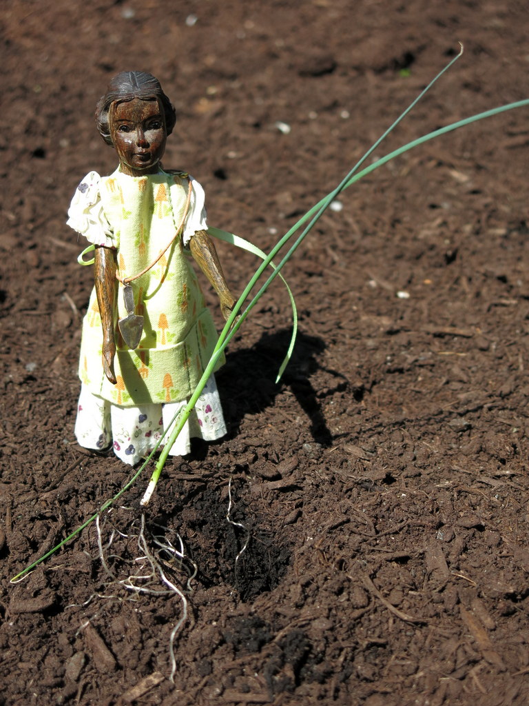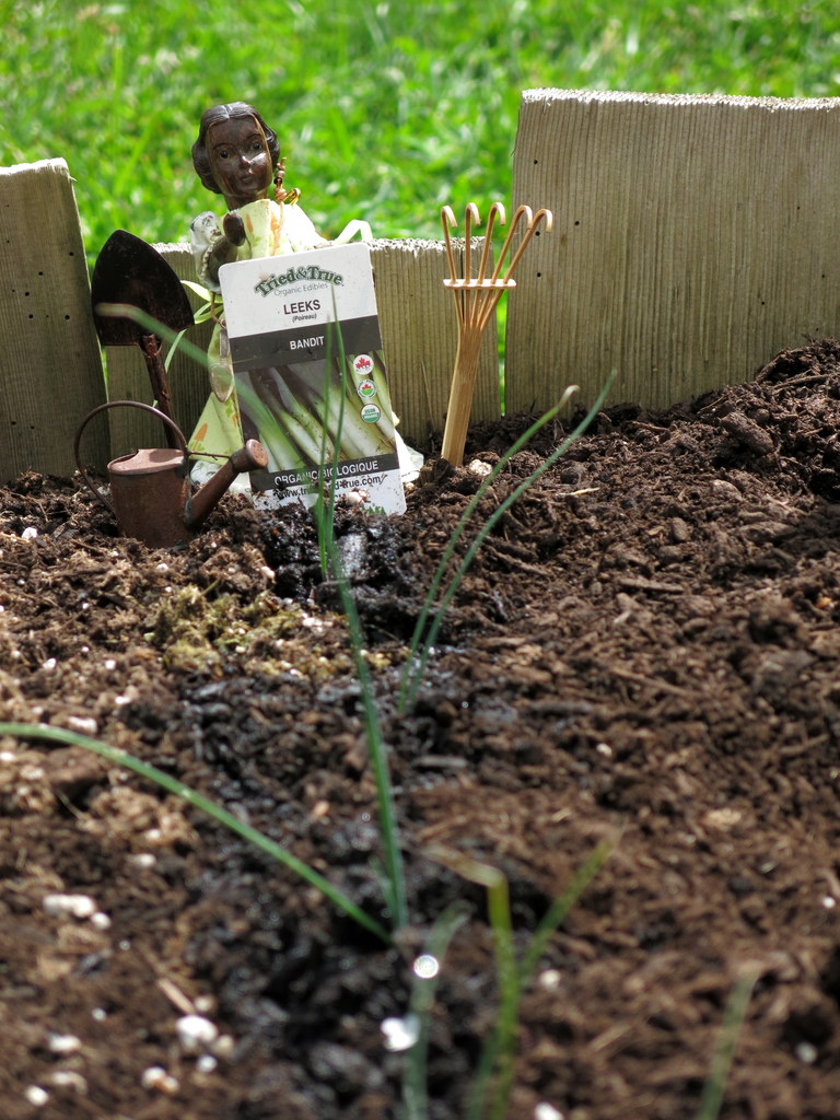 Perdita is very happy shoving the leek plants, and a wee sprinkle of dirt back into the leek holes!