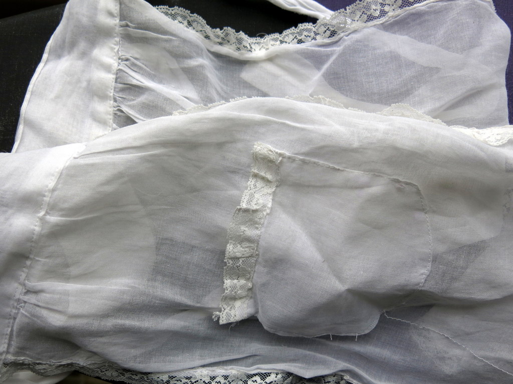 …which I made from the very finest cotton in my scrap stash…a 1950’s chiffon hostess apron. The apron had a ripped pocket and big stain at one edge, but otherwise was in very good condition.  Luckily one panel of the apron was big enough to cut a 20 cm square. It has a tiny rolled hem.