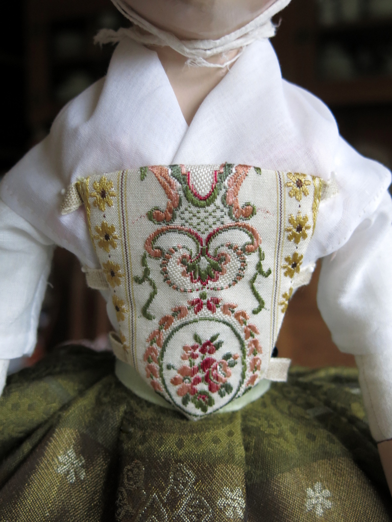 The stomacher is made from a tiny scrap of what may be Spitalfields Silk brocade bought in London by Lady Frances’s mistress.