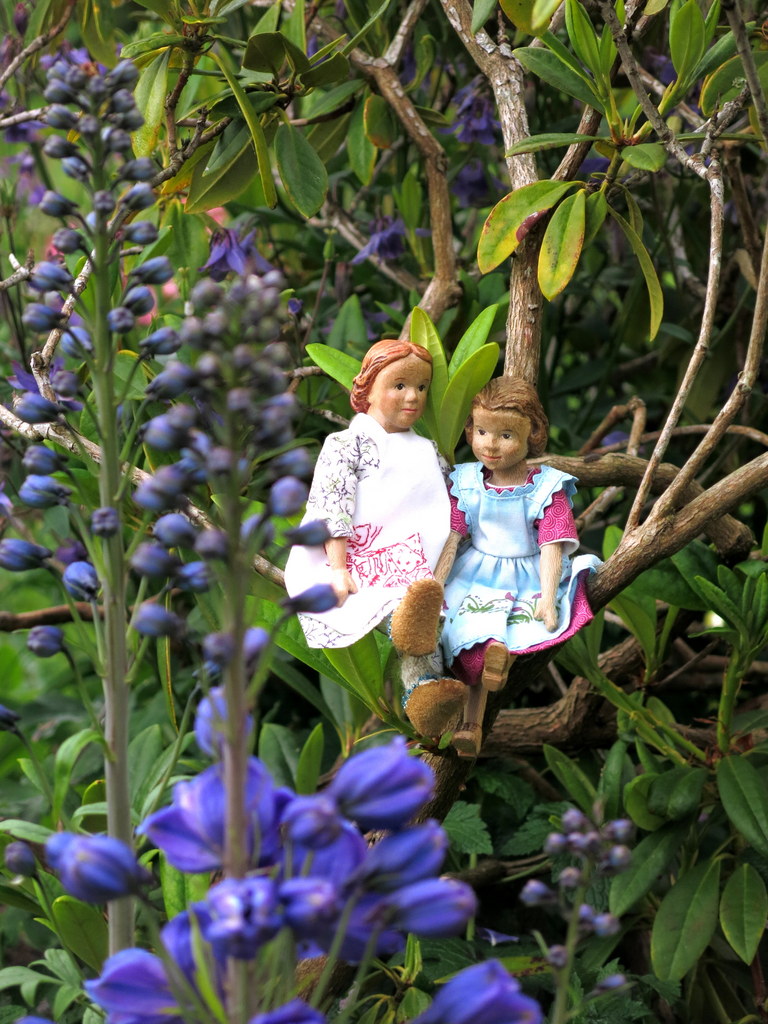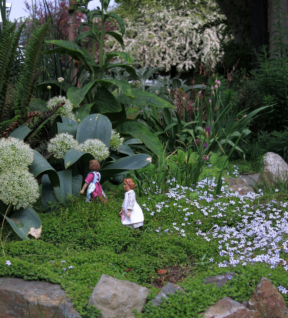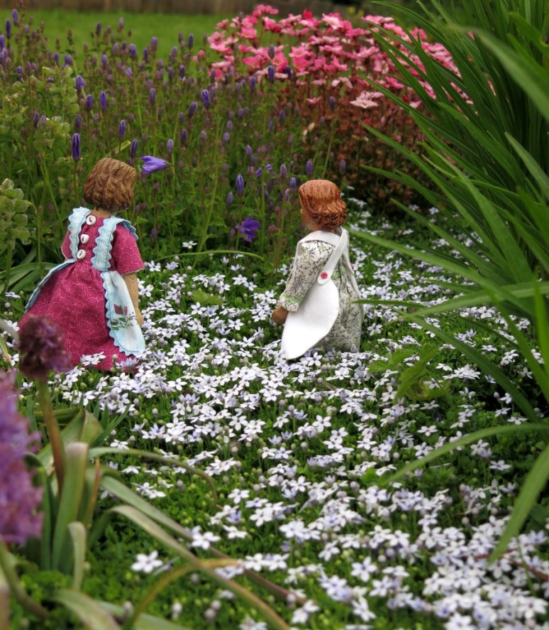 The spring has been so cool – wind storms, rain and generally chilly days and nights. The flowers seem to be late in blooming, but lasting longer than usual. Perhaps they appreciate keeping damp with the rain and not being exhausted by the sun. After a couple of dry days Arianell and Floradora went to visit the garden – they love it when the Blue Star Creeper is flowering…
