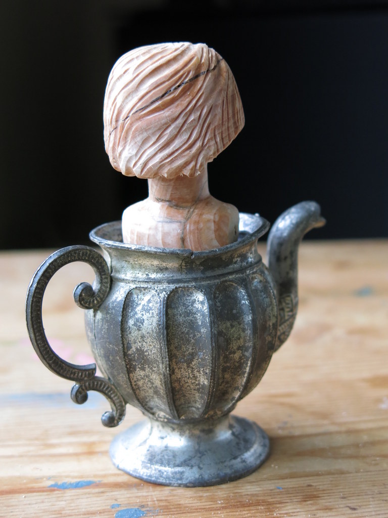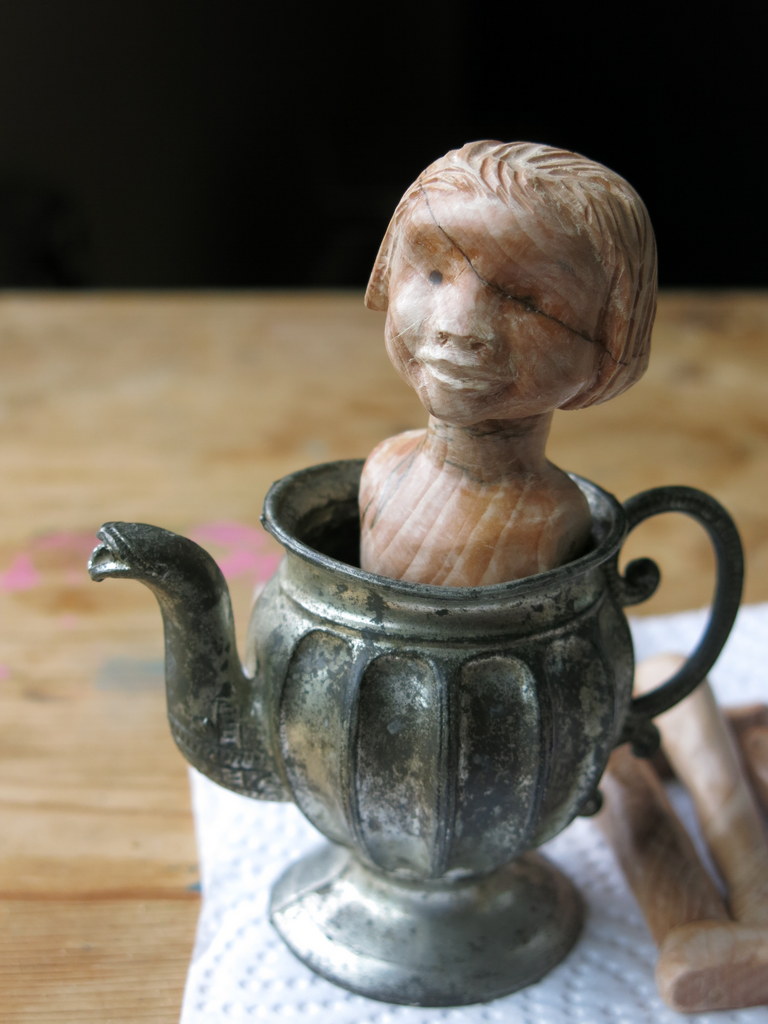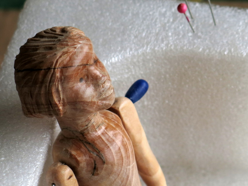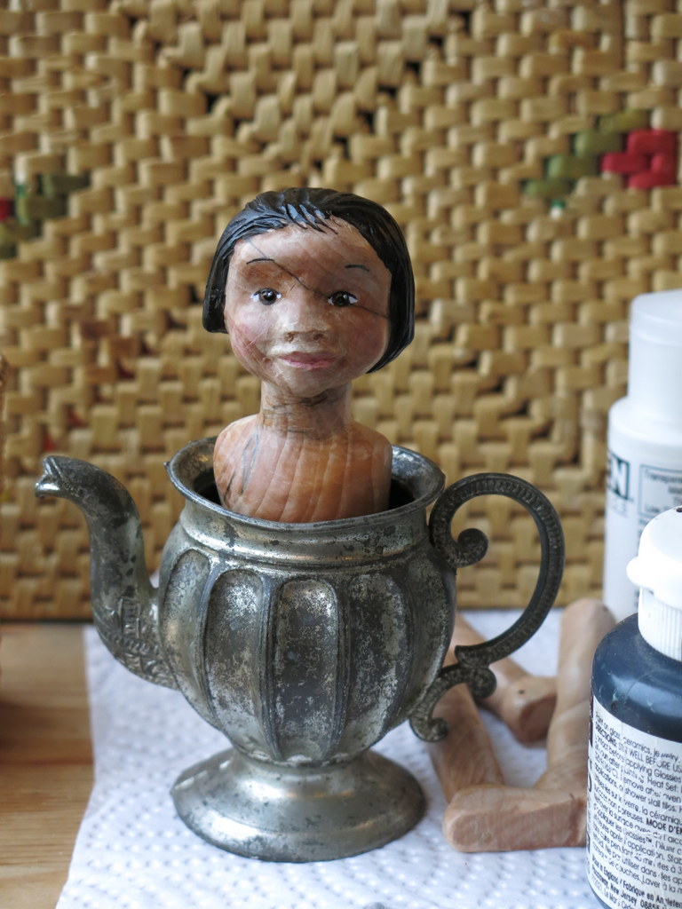 The extra bits available for arms and legs were twisty and difficult to work – bits broke off with alarming frequency, I had to start a whole new arm, and get a second foot carved…I had been warned by the kind person who turned the blanks that she had found it difficult to work with on her lathe, and that it might be hard to carve – she was right!