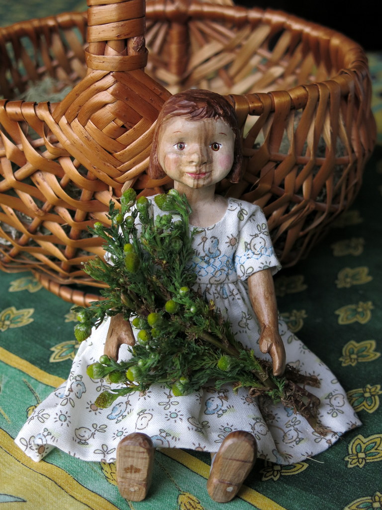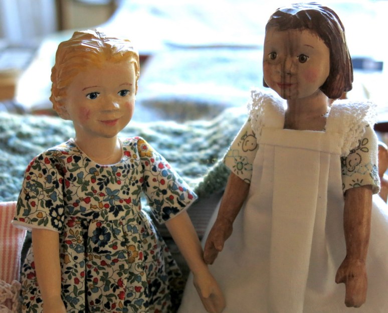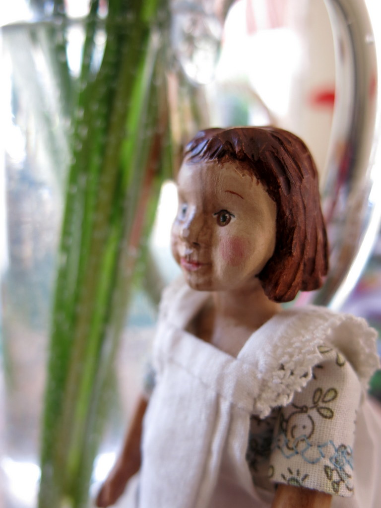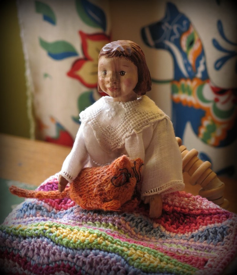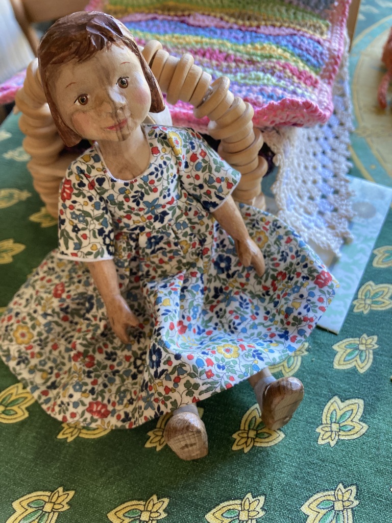 Abigail is the newest doll in the Hitty cupboard, and she seems to be a photogenic little Hitty, so I’ve taken pictures of her doing this and that! A friend sent some pretty fabric, so I got busy sewing…