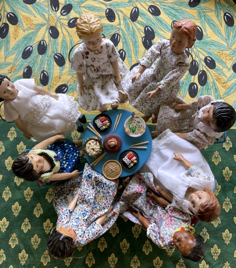 It is pretty fabric and makes a sweet summer dress! Viola has it on in this photo. Everyone had Sushi for lunch, and steamed rice and noodle soup and cake (and I made four more dresses from this fabric – many thanks to the friend who sent the fabric so I could spread the joy around)!