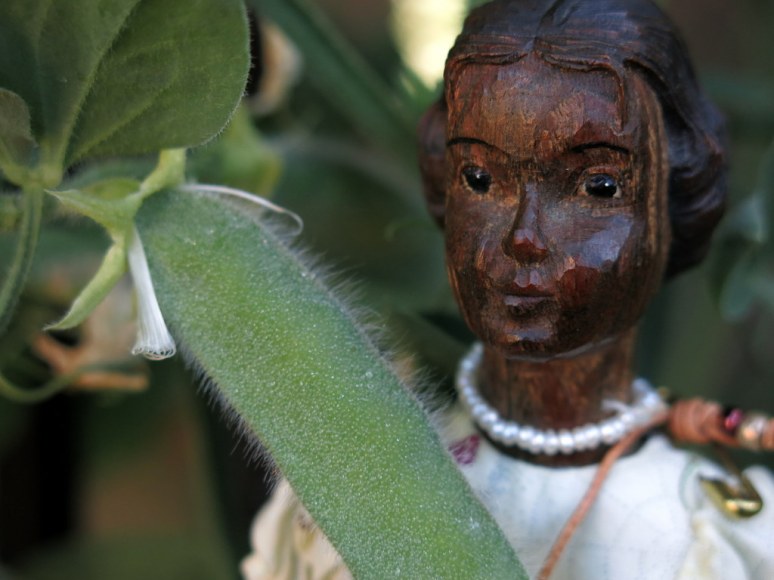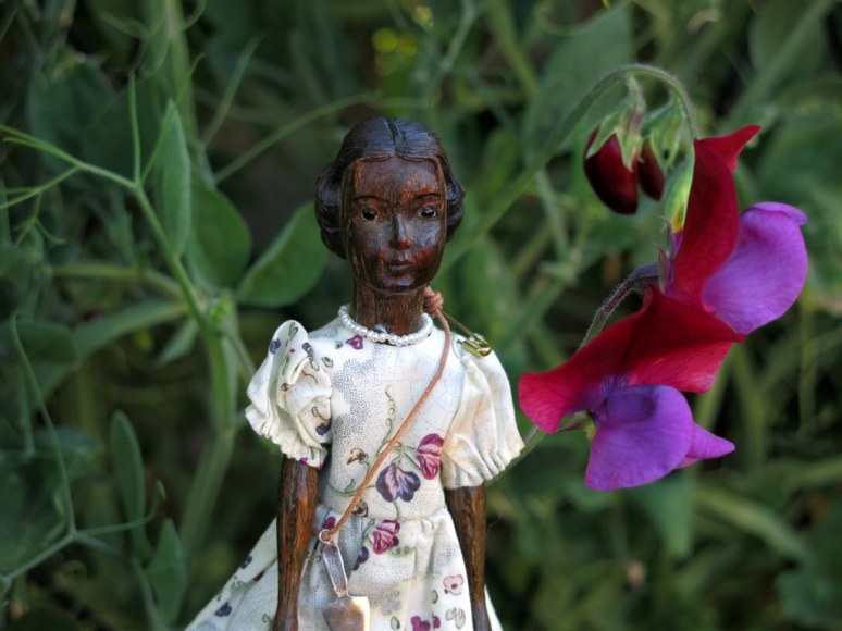 This day is about green…but Perdita wanted to show you how perfectly her sweet pea dress matches the sweet pea flowers, and after all the pea halums are green, and Perdita’s Palo Santo wood is quite green!