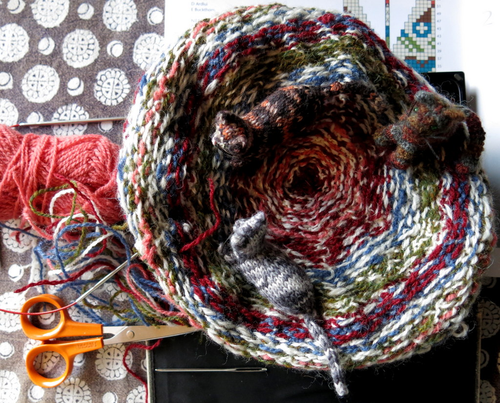 Having the kitties there will help pass the time while you weave in those ends…assuming that’s what you do with knitting? I’m more familiar with crochet. It will be a beautiful tam the way it looks…memories for the cats?