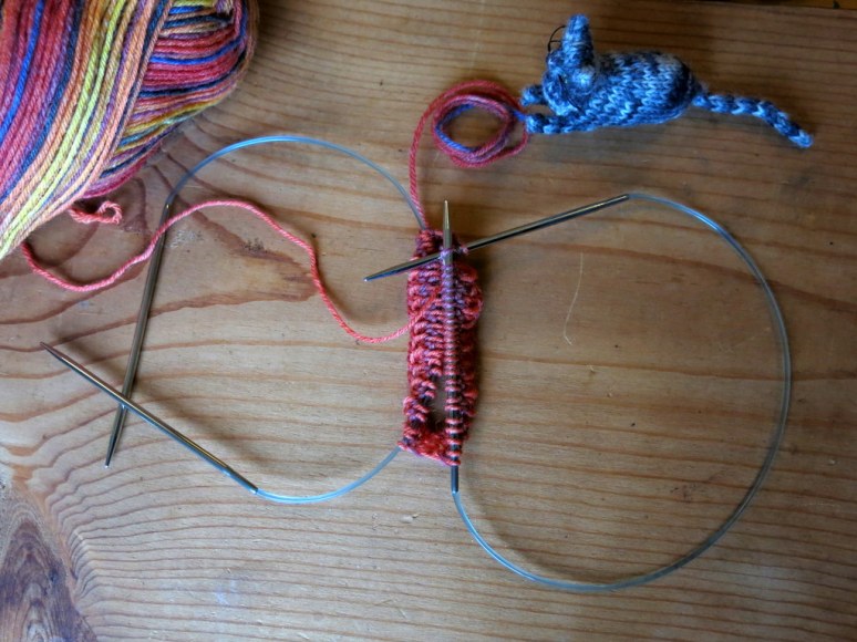 Sunset sock number two is begun. When two circular needles are used, half of the total number of stitches is worked on each needle. In this case there are 60 stitches in the sock, 30 on each needle…you knit from one end of the circular needle onto the other end of the same needle! Then the yarn is in position to continue knitting around on the second needle! It’s one of those things that sounds complicated when you describe it, but makes sense when you do it!