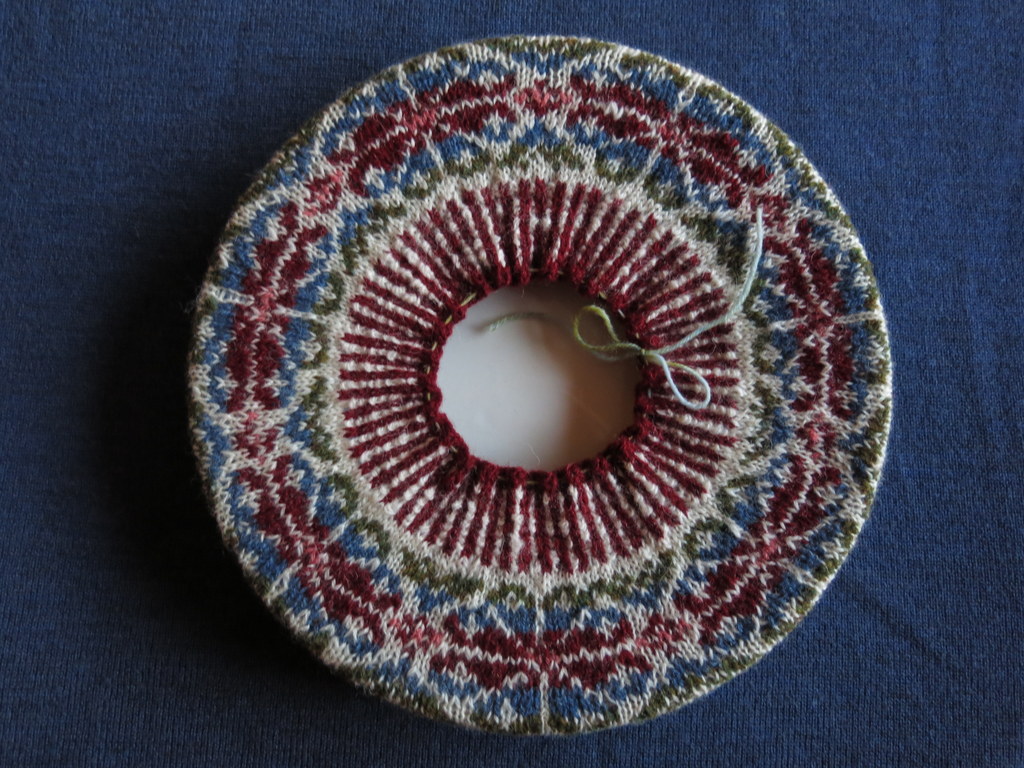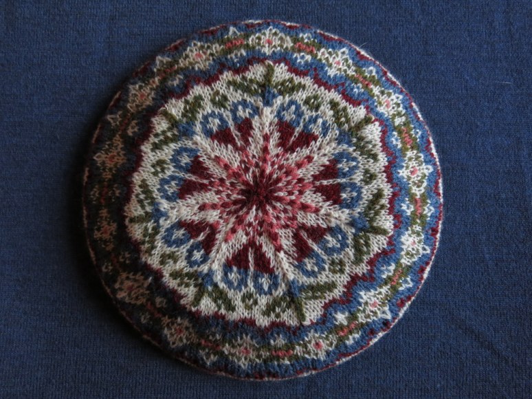 Meanwhile the Shetland wool Fair Isle tam has been blocked over a dinner plate…