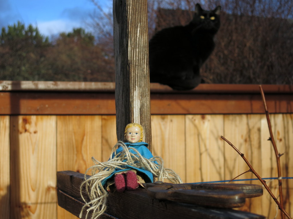 Siyah has been a very busy cat this year – keeping an eye out for birds in the raspberry patch while I tied up the canes on a cold winter day…