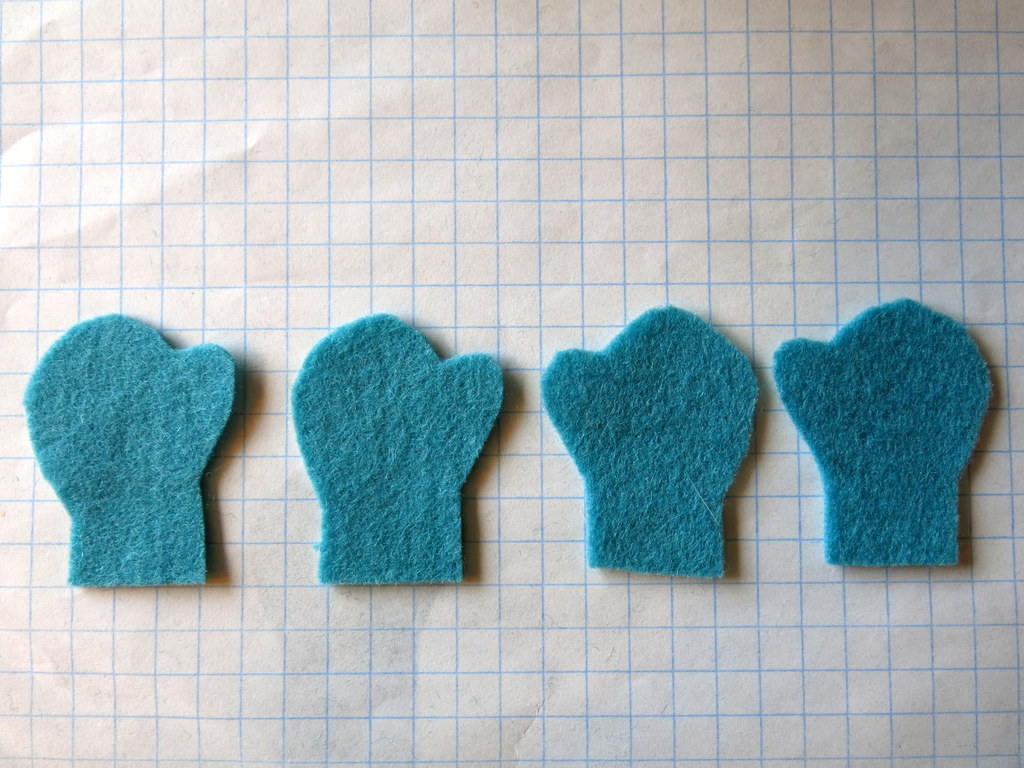 I arranged the four felt shapes in a line with two thumbs pointing right and two thumbs pointing left. This is so I don’t get confused when I am adding the decoration…I only want to decorate the back of the hand part of the mitten, not the palm. It is easy to accidentally decorate two backs by mistake. Of course it isn’t the end of the world if you end up having to make one more mitten (or even two!).