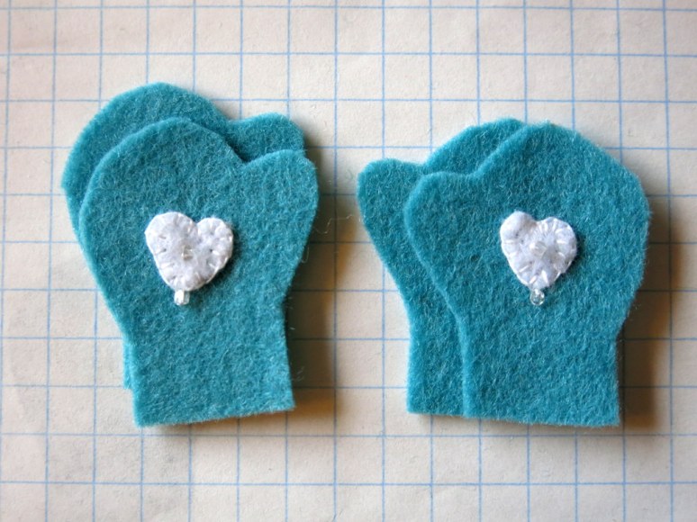 I decorate the middle two mittens so there will be one left mitten and one right. I have cut out a little felt heart, appliqued it to the mitten with blanket stitch, and a couple of beads. Other shapes are cute too, or embroidery or a combination of both.