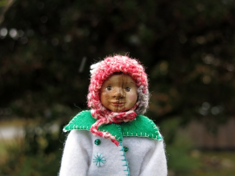 how kind to keep ones friend company. The little tea party looks quite cozy. Abigale looked very well dressed for a snowy day….lovely coat and warm mittens. We must get Holly some mittens!!
