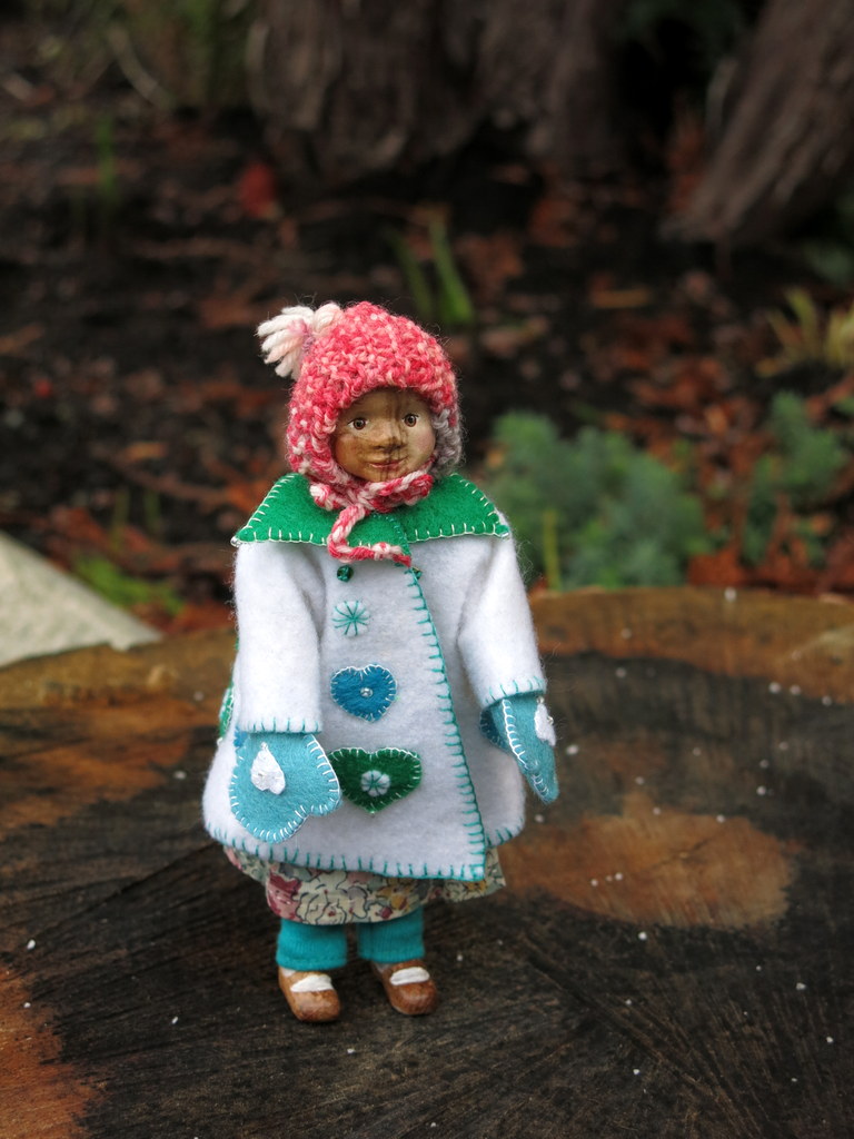 how kind to keep ones friend company. The little tea party looks quite cozy. Abigale looked very well dressed for a snowy day….lovely coat and warm mittens. We must get Holly some mittens!!