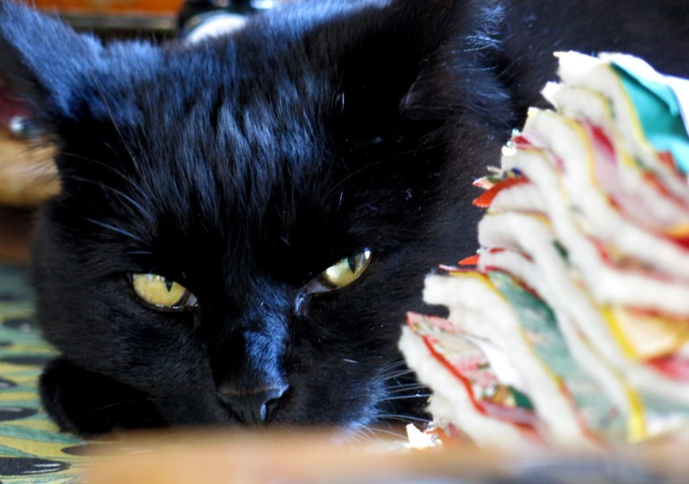 • It was one of those projects that fit right in to what I wanted to do with it. I was surprised at how “complete” the final quilting stitches made each tree! And yes, Siyah would prefer to lie on top of whatever I am working on, or else bat it to the floor. Constance is much better behaved!