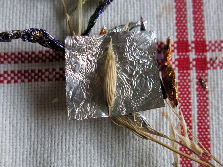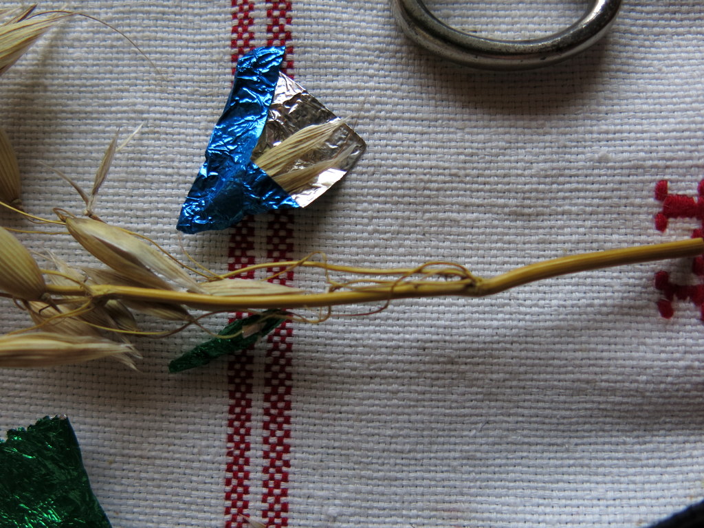 A very old lady taught me this method of making pretty Christmas decorations using scraps of foil sweet wrappers, and oat straws with the oats still attached…