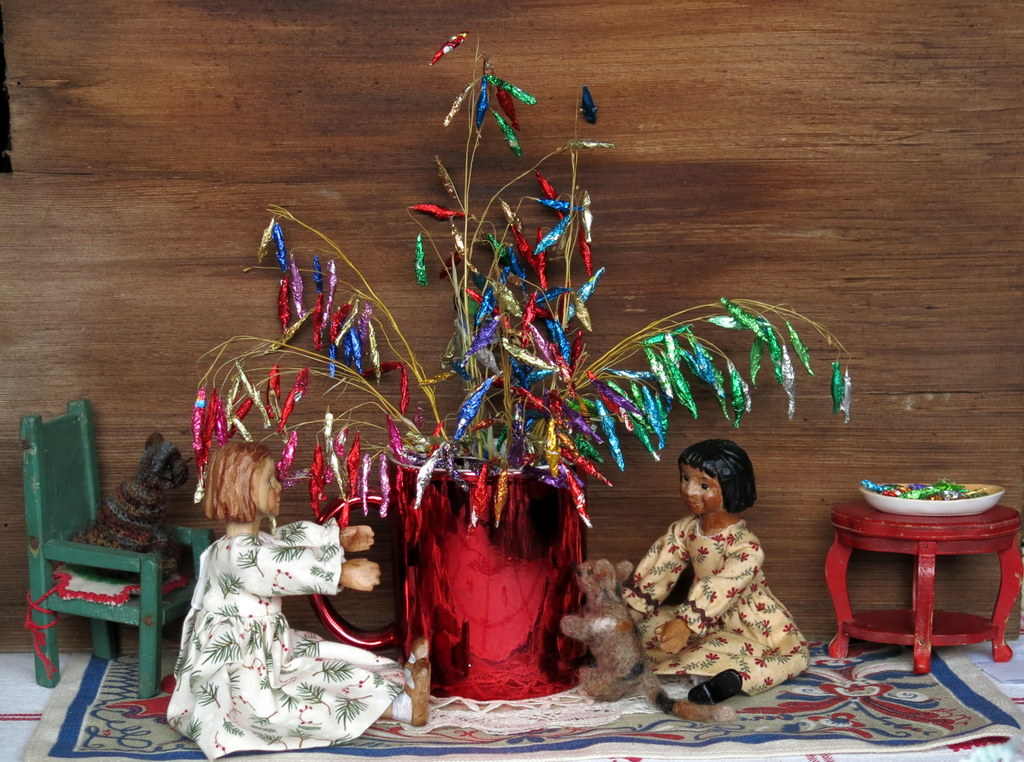 We like how the little foil-covered oats shimmer – an effect you can’t see in a still photo…but believe me they do! My very old friend said that 100 years ago when they couldn’t afford any fancy decorations, her family used to collect their sweet wrappers all year, and fill their house with these little droplets of colour.