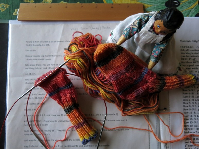 The human socks that I made with the orange striped yarn looked like sunsets to me…the baby socks look like little tiger paws!