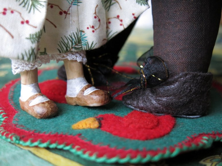 I also tried my hand at cobbling, using felt for uppers, leather soles, and ribbon ties! The big doll has very silly feet – it wasn’t easy to make a shoe with a tiny foot bed with a giant ankle… I may try again making a shoe with a longer foot bed and stuffing in the toes.