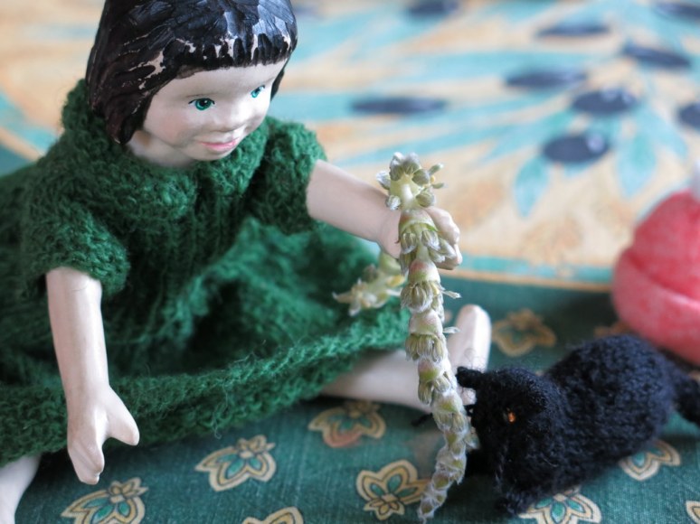 On her way to visit the Quimper Hittys and Blueberry, Holly came across a catkin tree…